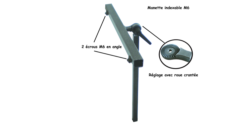 Equerres Fixation tablette réglable - roues crantées Ø26 - 1 manette indexable M6 - 2 écrous M6 en angle |